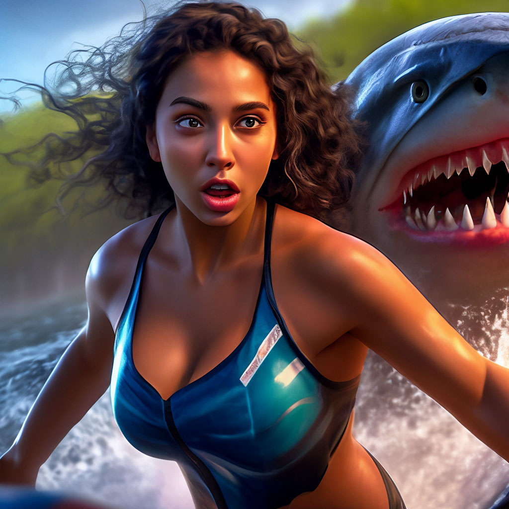 "Selfie. Terrified Alana Suarez on the surf, lush bust, swimsuit, with huge eyes